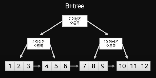 - B-Tree의 리프노드들을 LinkedList로 연결하여 순차 검색을 용이하게 함 (⇒ 범위검색이 매우 쉬워짐)
