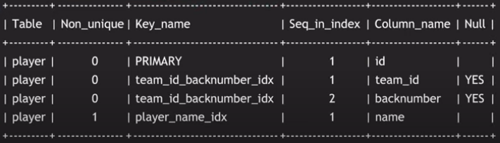 SHOW INDEX FROM player;
