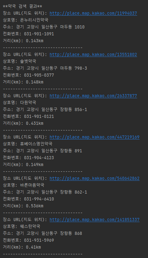 }- JSON으로 받은 여러 응답값 중 장소 URL(place_url), 상호명(place_name), 전화번호(phone), 거리(distance)를 파싱하여 변수에 저장한다.