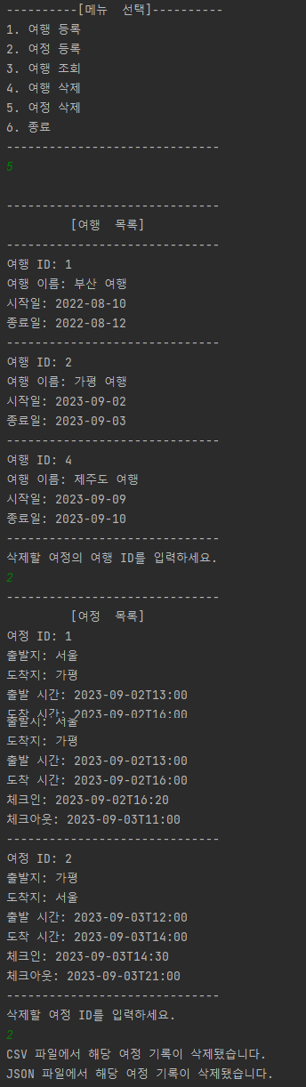 - 여행 정보 및 특정 여행 정보의 여정 목록은 데이터 저장 경로(CSV, JSON 등)에 파일 형태로 저장됩니다.