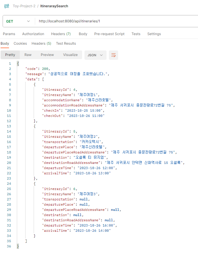 개발을 진행하면서 Postman을 통해 API test를 진행했다. 담당한 여정 조회 API postman test는 다음과 같다.