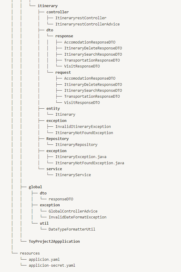 패키지구조 설계는 대표적으로 ‘계층형’ 구조와 ‘도메인형’ 구조가 있다. 그 중 도메인형 구조는 각각의 도메인 별로 패키지 분리가 가능하여 도메인 별 관리가 직관적이다. 도메인 별로 의존하는 코드가 없도록 설계가 되었기 때문에 추후에 기획이 추가되더라도 코드를 재활용할 수 있기에 domain형 구조를 선택했다. 실제로, 이전 Toy#1프로젝트에서도 DDD 구조를 선택했기에 Toy#2 프로젝트에서 기획을 추가하여도 코드를 재사용할 수 있었다.