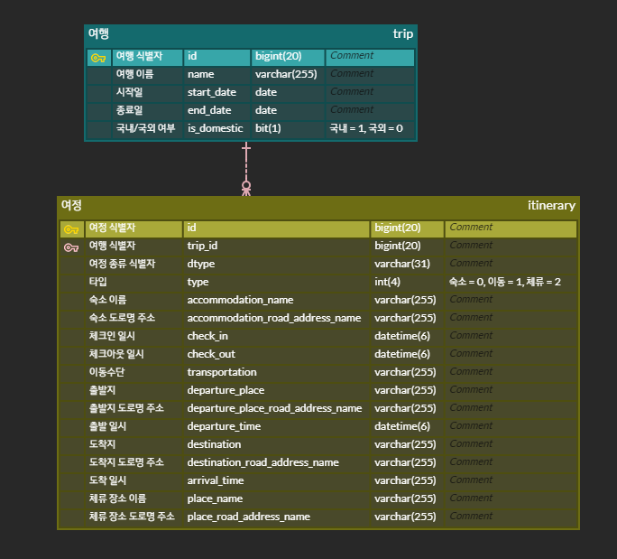 - 여행 정보는 여러 여정 정보로 구성됩니다. (여행 : 여정 = 1 : n)