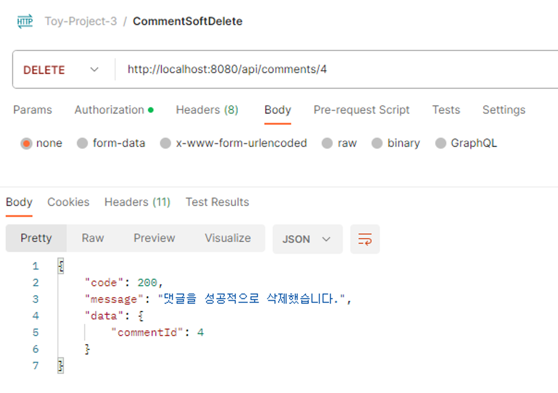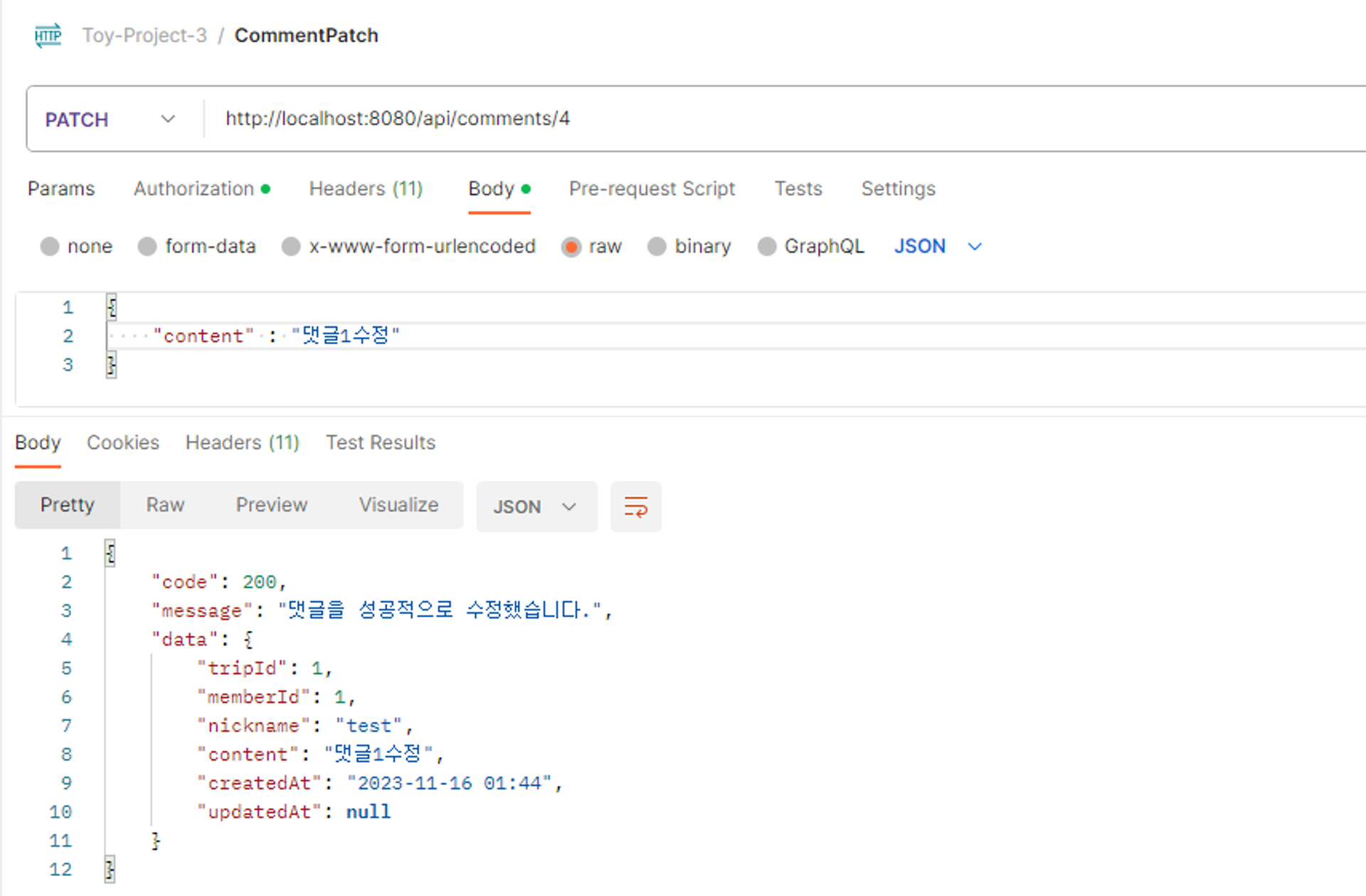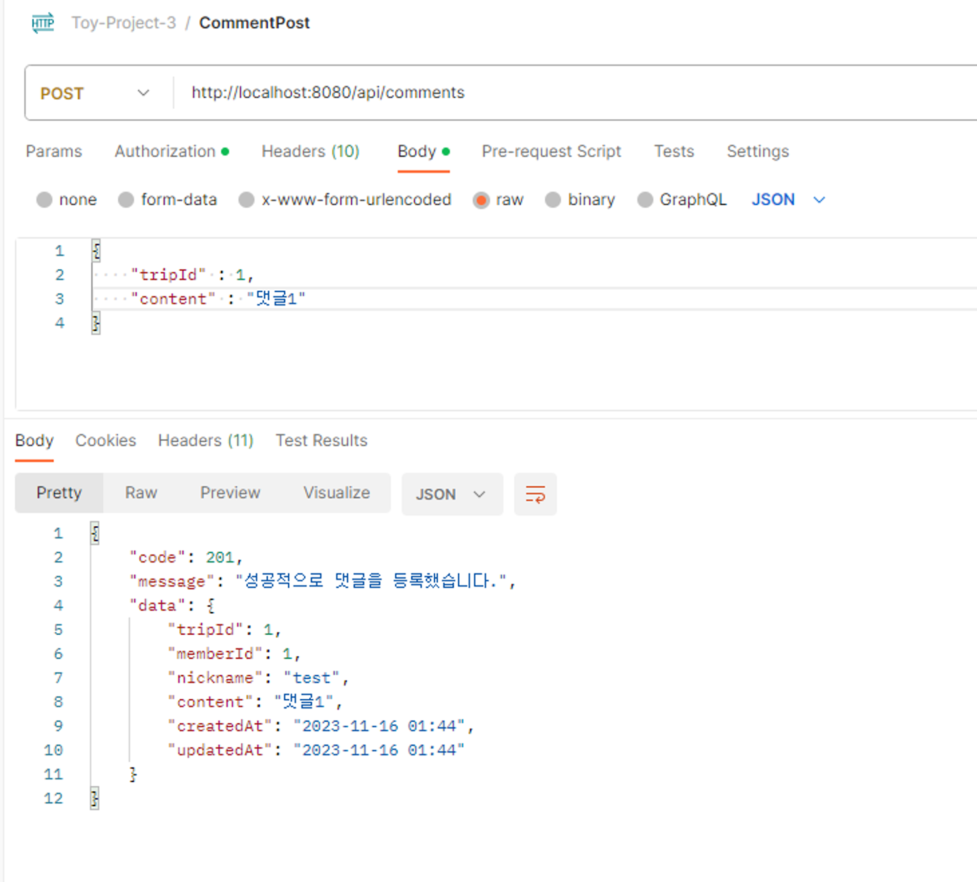 이번 프로젝트에서는 댓글과 관련된 CRUD와 여정 Delete API를 맡아 개발을 진행했고, 테스트 결과는 다음과 같다.