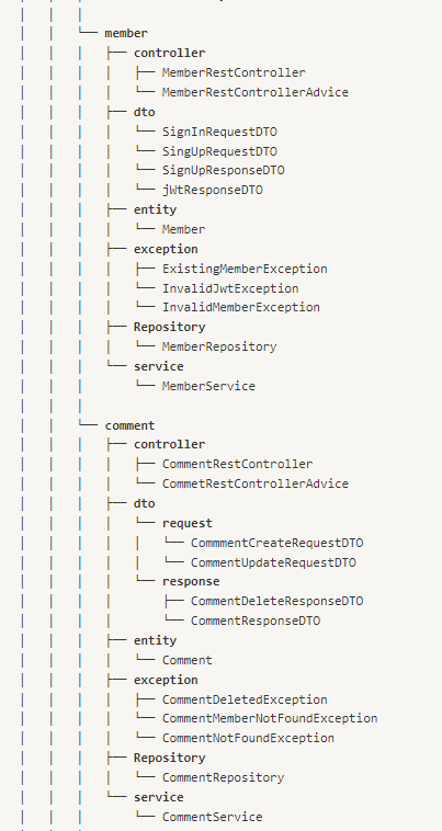 각각의 도메인 별로 패키지 분리가 가능하여 도메인 별 관리가 직관적입니다. 도메인 별로 의존하는 코드가 없도록 설계가 되었기 때문에 추후에 기획이 추가되더라도 코드를 재활용할 수 있기에 domain형 구조를 선택했습니다.