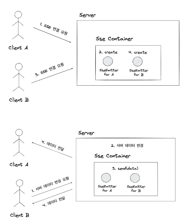 Server→Client: 서버 데이터 변경시, 해당 SSE 객체를 통해 데이터 전달